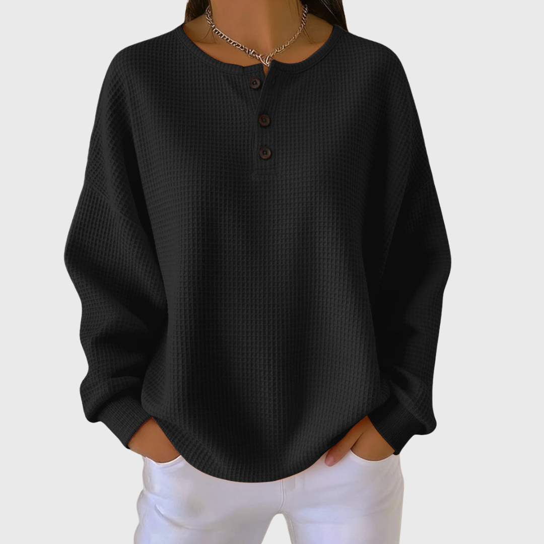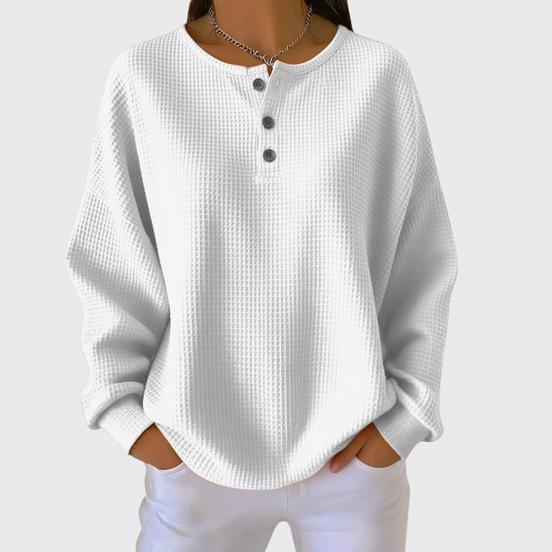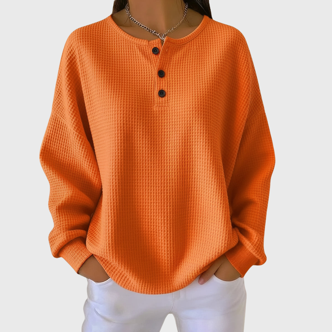 Останете приятно топли, дори когато температурата падне до 5°C, с нашия луксозен дамски пуловер – изработен от дебела, двойно плетена вафлена материя, която осигурява изключително меко и приятно усещане. Вътрешността е допълнително топла и се чувства като флийс на кожата, така че можете да се насладите на върховен комфорт в хладни дни.