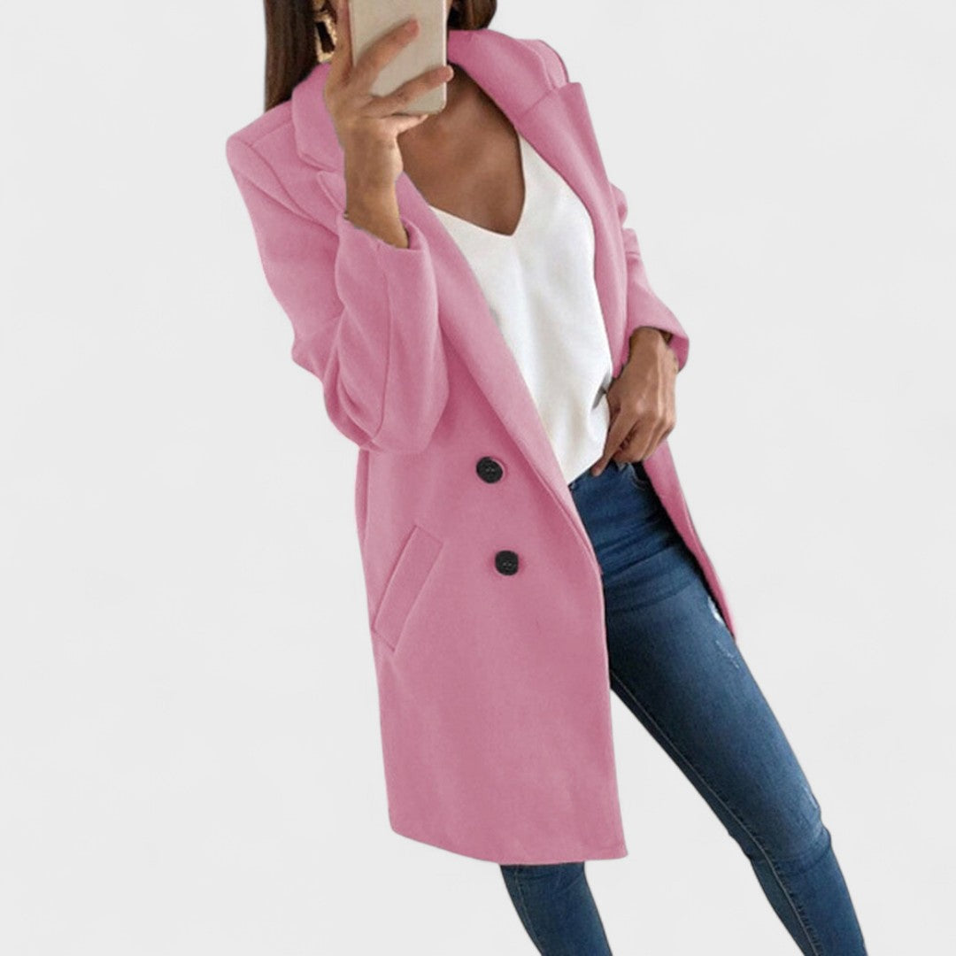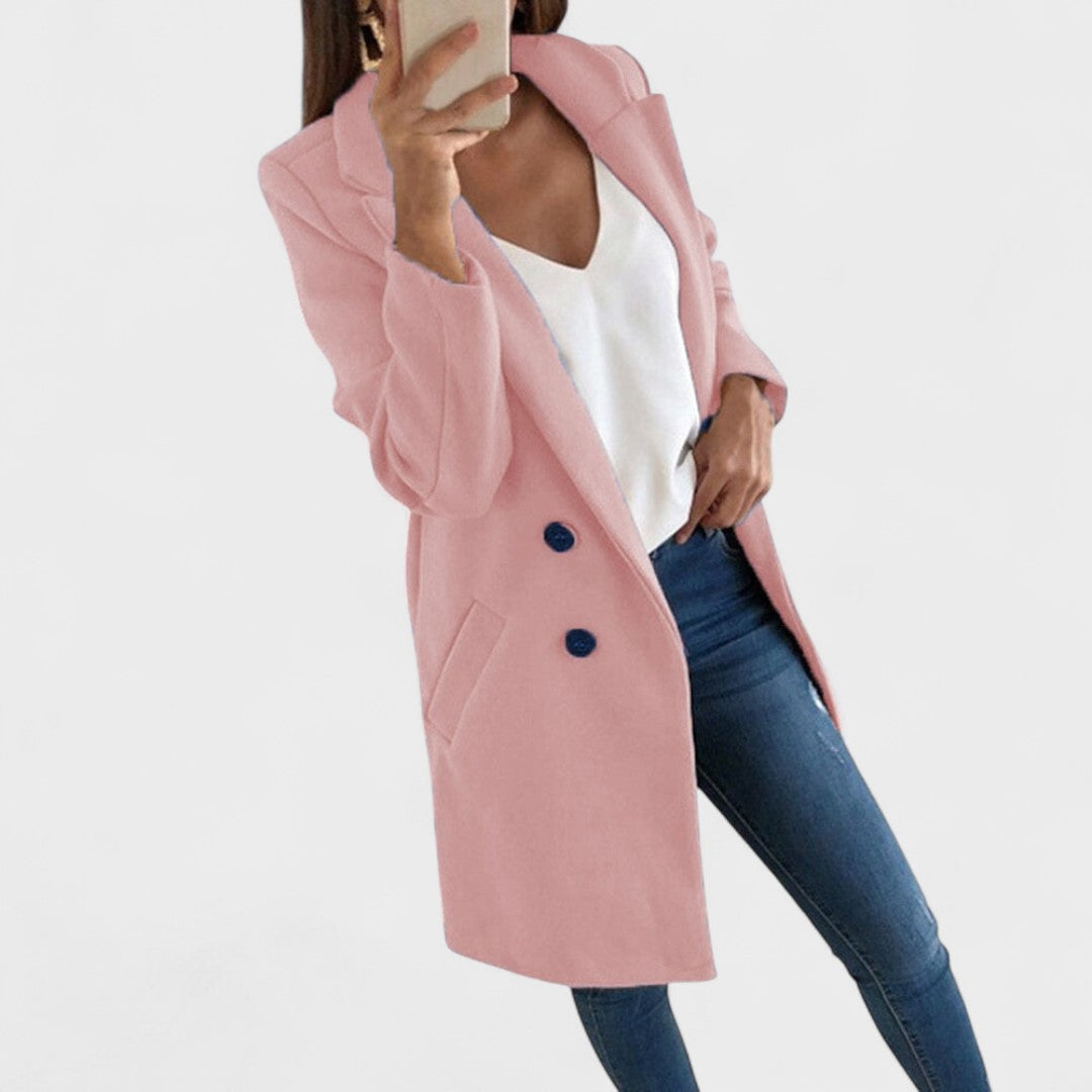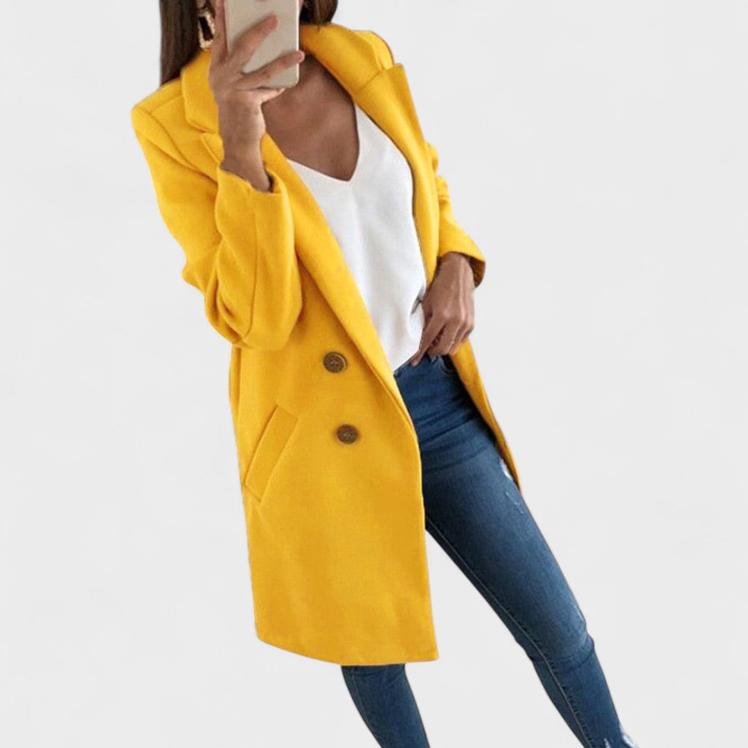 • Изгоден крой – чисти линии, ревери и дължина, която визуално удължава фигурата.