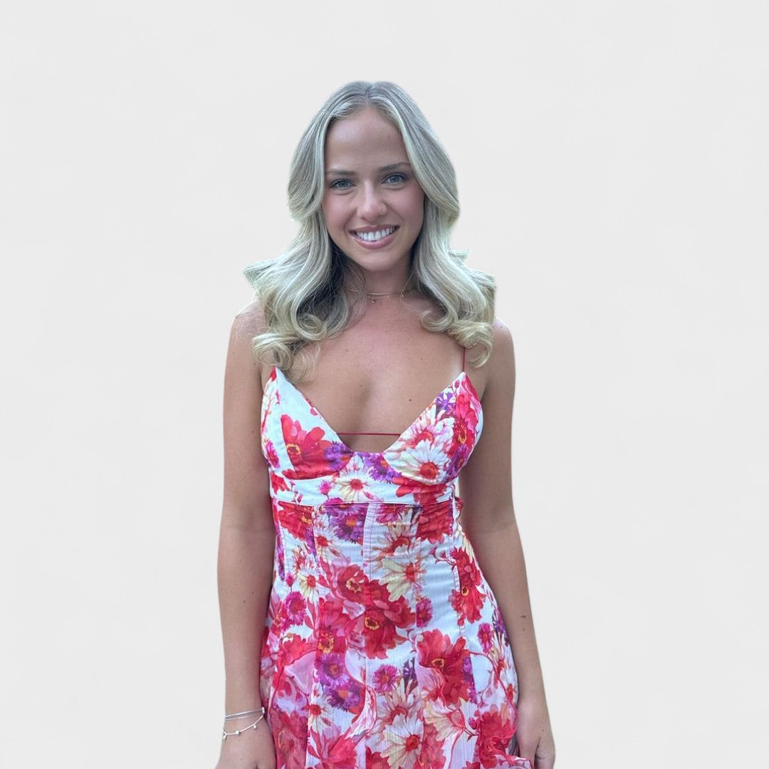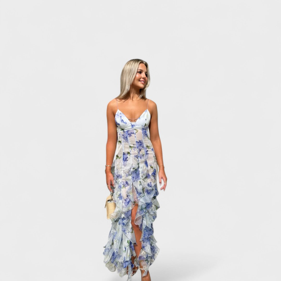 Тази дълга цветна рокля с волани внася нотка на изисканост и елегантност във всяка ситуация. Благодарение на женствения си силует и разкошните детайли, предлага безупречен баланс между комфорт и блясък. Идеална е за тържествени поводи, празненства или специални моменти, когато искате да блеснете.