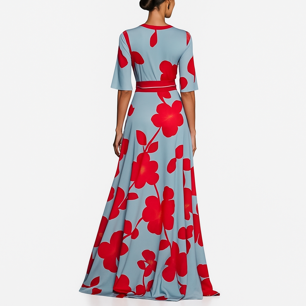 Забележителна макси рокля с дълбоко V-образно деколте и кимоно ръкави, създаваща изискана, издължена силуета. Подчертаният колан определя талията, докато разкошната, летяща пола с преден разрез придава драматично движение при всяка крачка. Практичните странични джобове са дискретно скрити в шева за доза ежедневна функционалност. Идеална за сватби, коктейли и всички специални поводи, когато искаш да изглеждаш уникално.