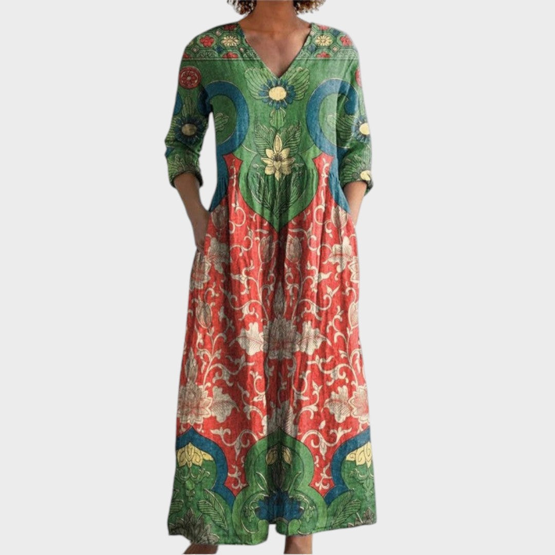 Тази рокля съчетава артистичен дизайн и комфорт в перфектен баланс. С богат етно мотив, V-образно деколте и практични джобове, тя е идеална за жени, които обичат оригиналността и свободата в облеклото. Леката кройка позволява лесно движение, а впечатляващите детайли придават специален чар на всяка повода.