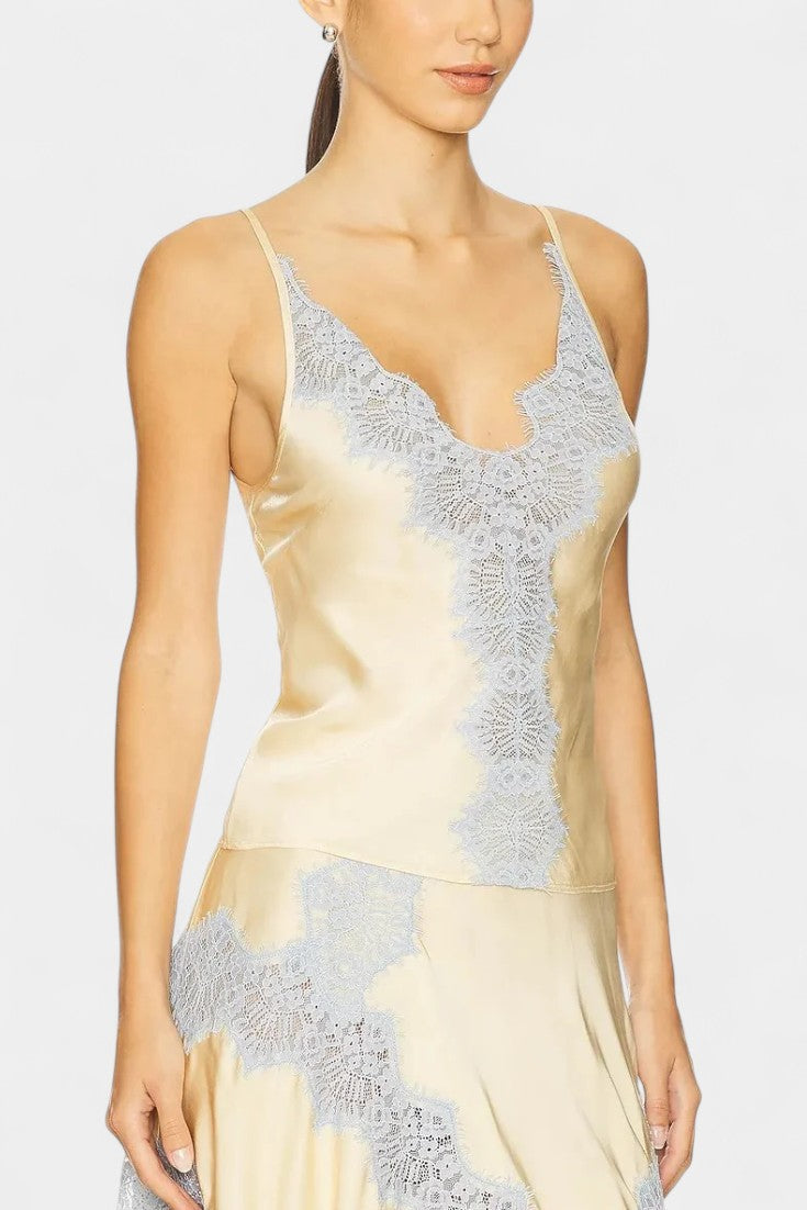Софистициран сет, който комбинира копринен блясък на сатена с романтични детайли за шикозен вид без усилие. Данича се отличава с топ без ръкави с тънки презрамки и ласкав деколте, балансирана с флуидна миди поличка, която носи естествено движение. Контрастната дантела в деликатни тонове добавя ретро френски акцент, превръщайки този дизайн в изтънчено и универсално предложение.