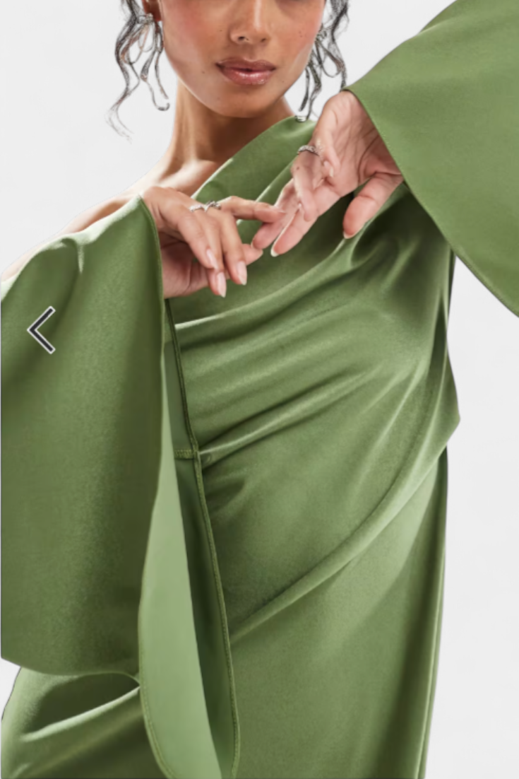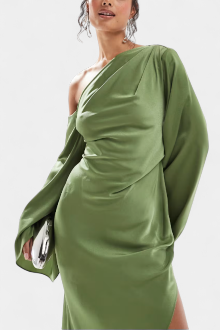 - Деколте с едно рамо, което носи модерна и елегантна нотка