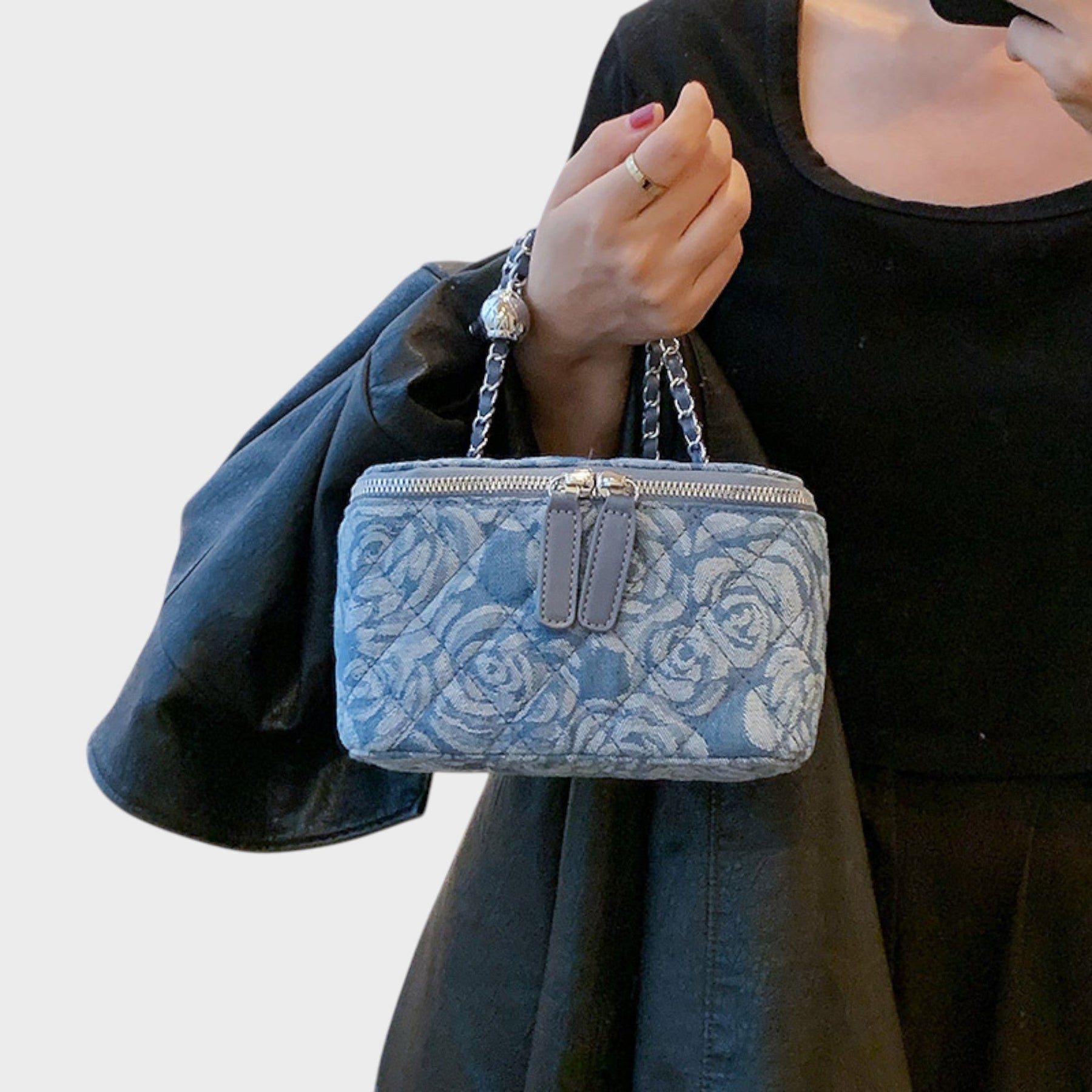 Тази чанта е перфектният избор за тези, които обичат стил с романтичен нюанс. С релефен цветен мотив и изискан текстилен завършек, тя носи лек, креативен и женствен вид. Нейната структурирана форма и дръжка с верига придават баланс между небрежност и елегантност, правейки я уникален аксесоар, който подчертава вашата личност при всяка повода.